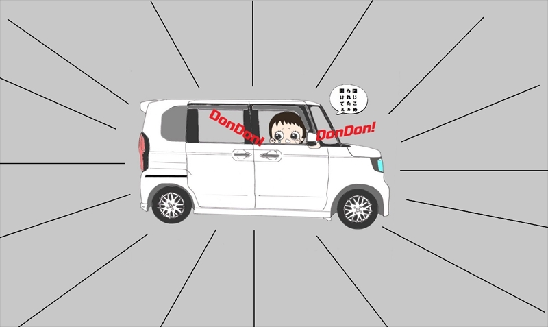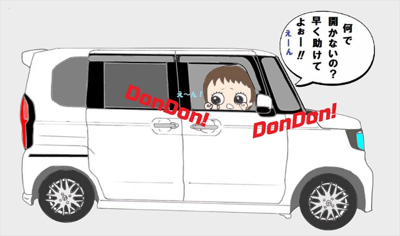 どうやら、パワーウィンドウを開けようとして間違ってドアロックボタンを押してしまったらしく、窓もドアも開かなくなったからパニックになり窓を叩いて助けを求めていたんです。