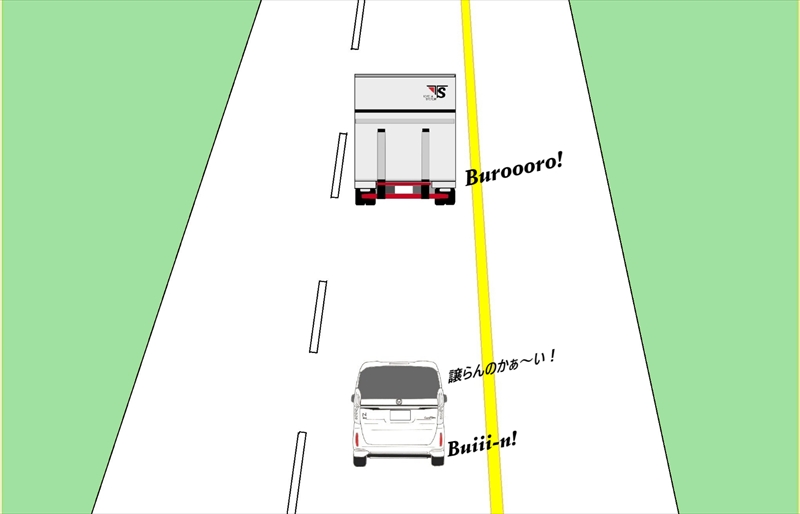 冒頭のイラストで「譲らんのかぁ~ぃ!」と言っているのには訳がありまして、このトラックは世界に名だたる某超優良企業の社名を背負ったトラックだったので企業イメージの悪化を鑑みて、この低速度ならば当然ゆずり車線に移ると思っていたからです。