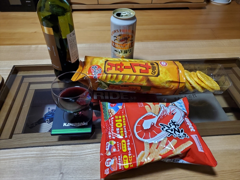 帰宅後は軽く夕食を済ませた後にMEGAドンキで購入した「亀田のカレーせん」と「カルビー かっぱえびせん」で晩酌♪