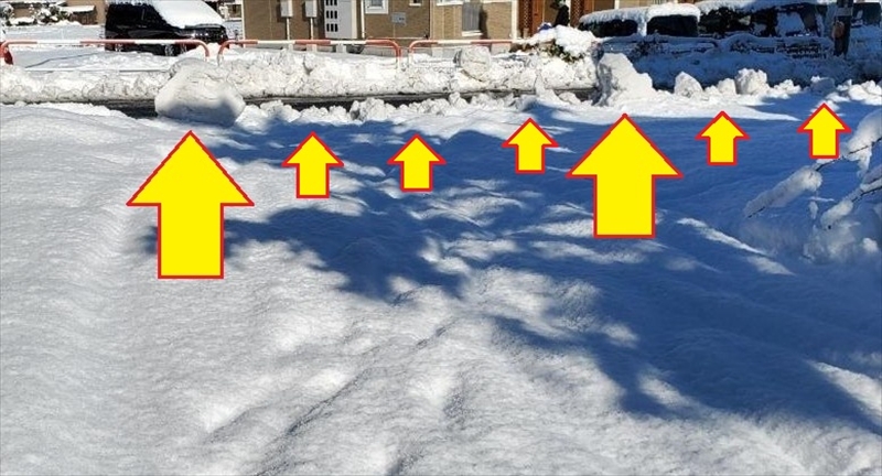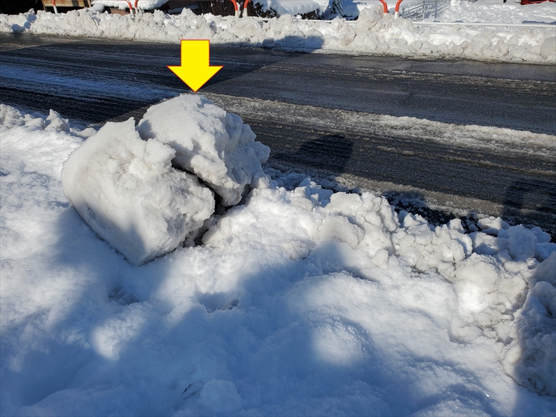 普段は20cm程度の積雪は生活に差し支えない地域なのですが、除雪車の運転手さんが不慣れだったのか、車庫の敷地と道路の境目に大小の雪塊が多数転がっておりました。