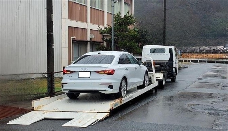 購入から3年目を迎えたアウディA3の初回車検予約でディーラー担当に連絡すると「〇〇日に伺います」ということでローダー車で引き取りに来てくれました。